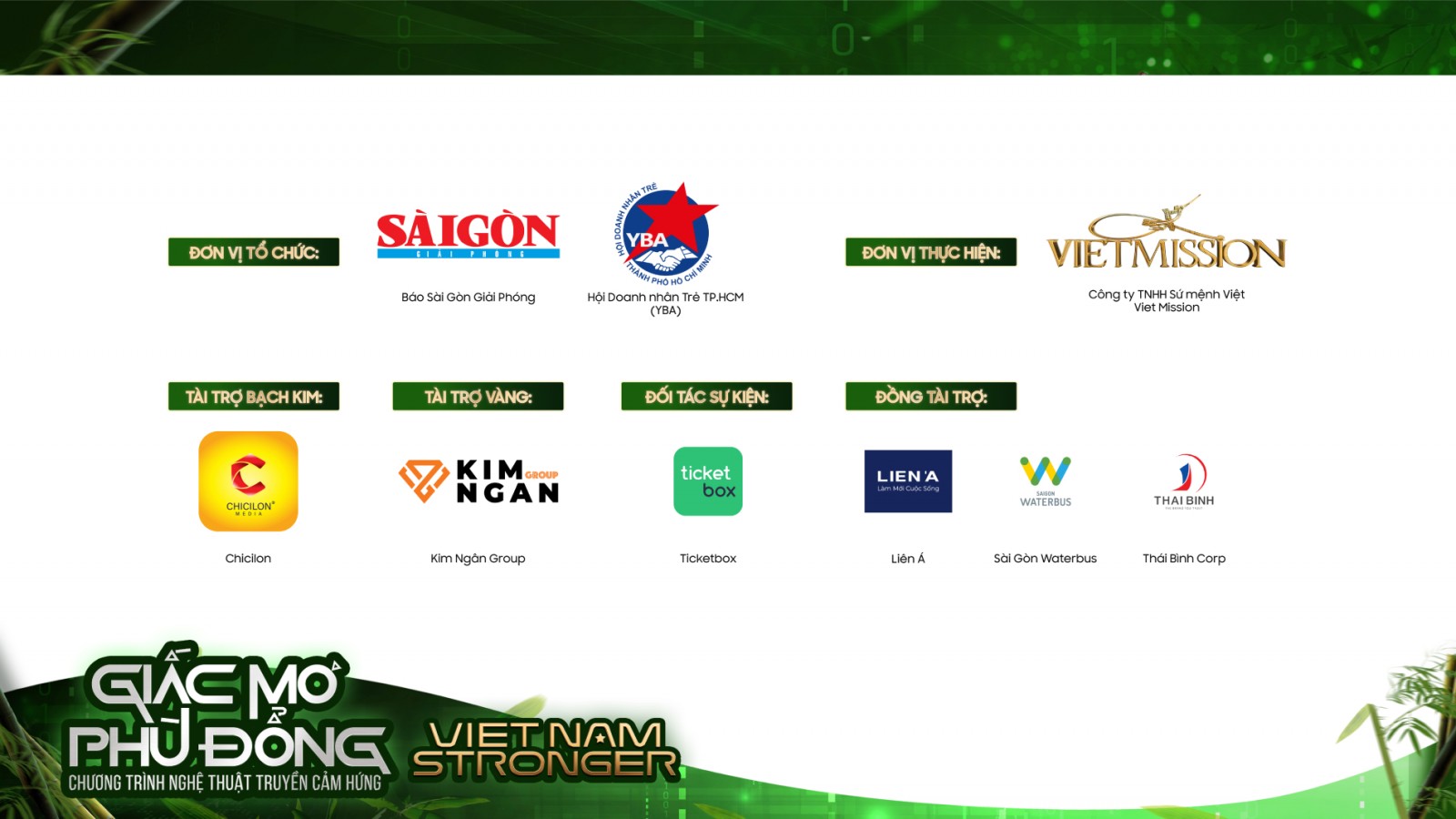 Chương trình nghệ thuật truyền cảm hứng “Giấc Mơ Phù Đổng” do Hội Doanh Nhân Trẻ TP.HCM (YBA HCM) kết hợp với Báo Sài Gòn Giải Phóng thực hiện. Được khơi nguồn cảm hứng từ hình ảnh mầm tre, hay thường gọi là búp măng non. Thấm nhuần thành ngữ “tre già măng mọc”, ví những thế hệ tương lai như những mầm tre cần được ươm mầm từ những tiền đề quan trọng như: môi trường, sức khoẻ và đặc biệt giáo dục. “Mầm tre” hôm nay, là thành luỹ tre xanh vững vàng ở ngày mai. Chương trình không chỉ truyền cảm hứng cho thế hệ trẻ vì một Việt Nam hùng cường, mà còn hướng đến mục tiêu: